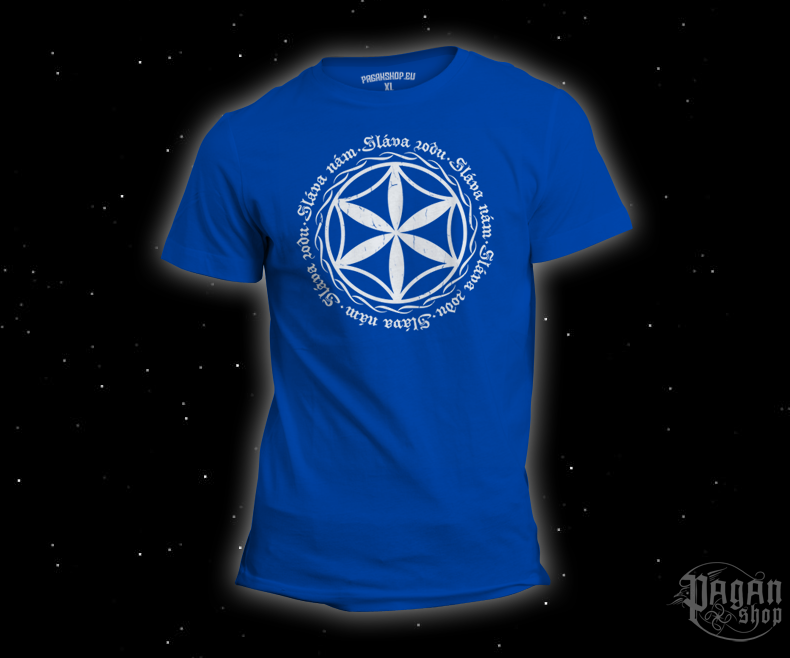 Svarga: Symbol světla a vesmírného řádu Centrálním motivem je Svarga – posvátný symbol boha Svaroga. Svarga představuje sluneční pohyb, tvořivou energii a dynamickou sílu vesmíru. Je to zářící kolo, které rozhání temnotu a chaos. Doprovodné nápisy „Sláva rodu“ a „Sláva nám“ pak tento význam doplňují o rozměr lidské hrdosti. Připomínají nám, že naše síla vychází z jednoty rodiny a národa.