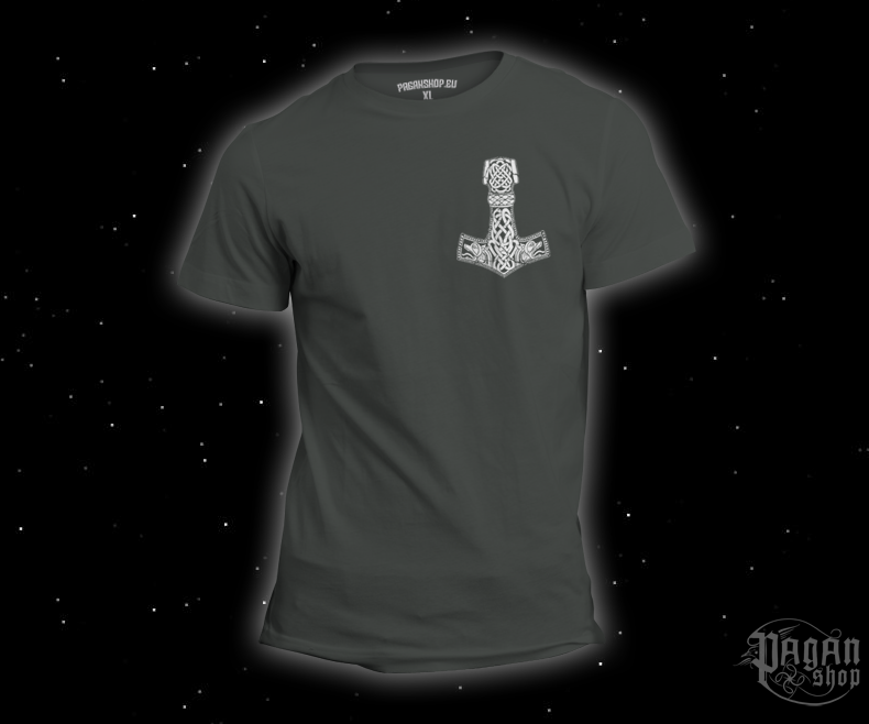 Spojení kladiva a vlčí nátury Unikátnost tohoto designu spočívá v detailech. V hlavě kladiva jsou vyobrazeny dvě vlčí hlavy, které mohou odkazovat na Ódinovy věrné společníky Geriho a Frekiho, nebo na nespoutanou sílu Fenriho potomků. Vlci v severské mytologii symbolizují věrnost smečce, instinkt a dravost. Spojením s tvarem Mjölniru vzniká amulet, který vás chrání zepředu (malý decentní potisk) i zezadu (dominantní velký motiv na zádech).