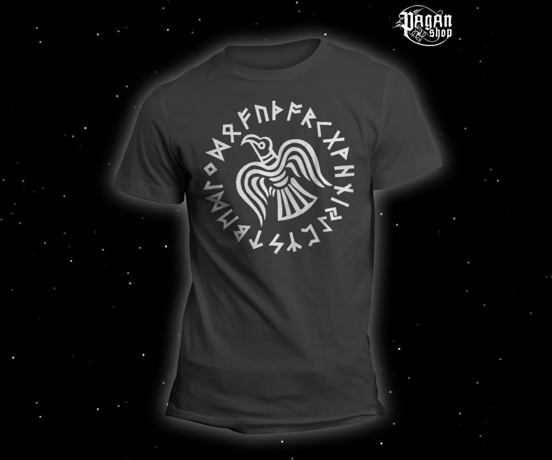Staňte se poslem bohů! Triko s vikingským havranem v kompletním runovém kruhu 24 znaků futharku. Symbol paměti a ochrany na prémiové 100% bavlně. Ideální pro moderní vikingy, kteří hledají hloubku a styl v jednom. Váš kousek historie z PaganShop.eu! celý popis
